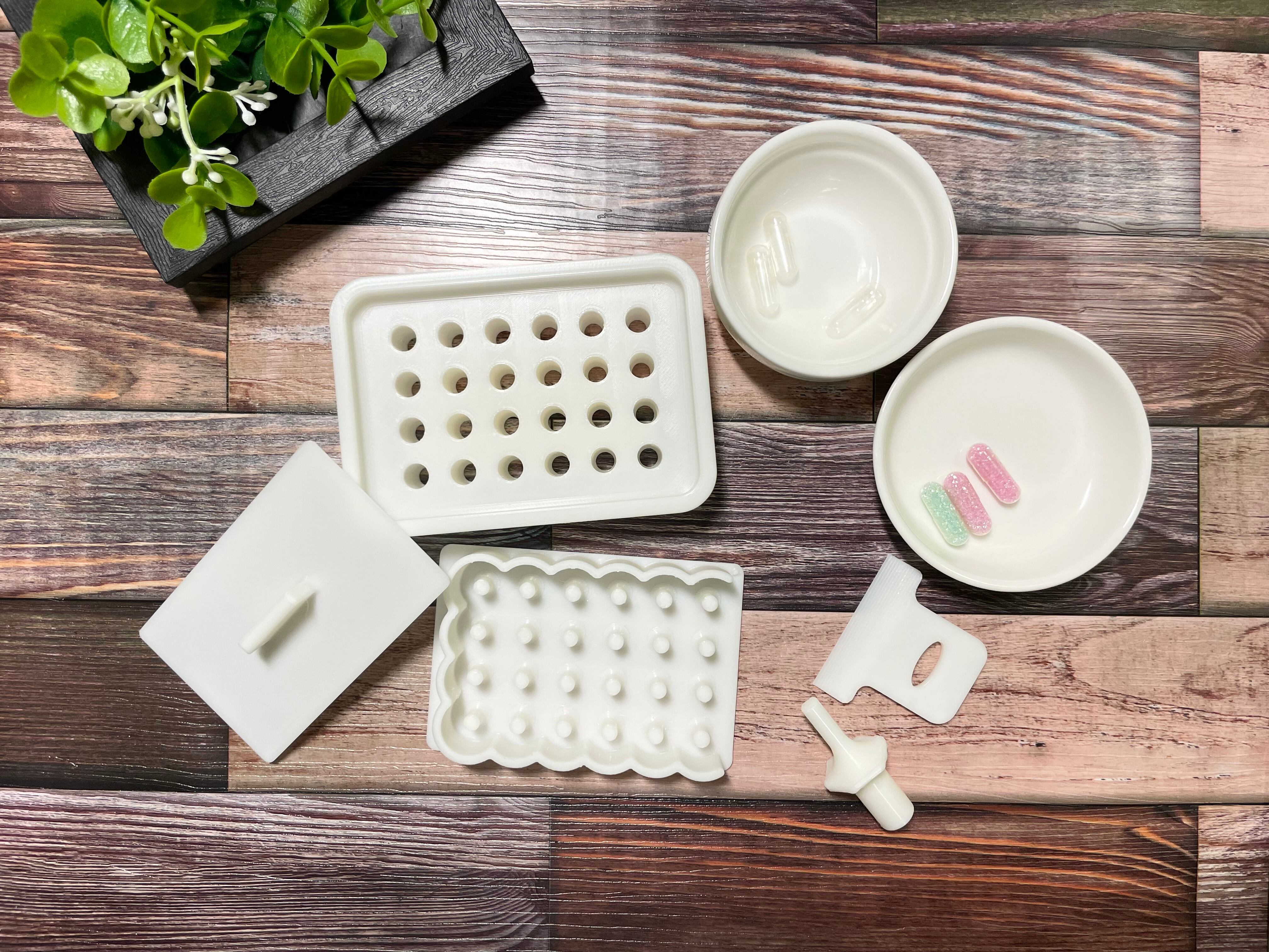 商品は、カプセルプレート、押し出しプレート、押さえフタ、押し棒、ヘラの5点です。素材はいずれもPLA樹脂です。