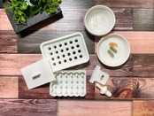 商品は、カプセルプレート、押し出しプレート、押さえフタ、押し棒、ヘラの5点です。素材はいずれもPLA樹脂です。
