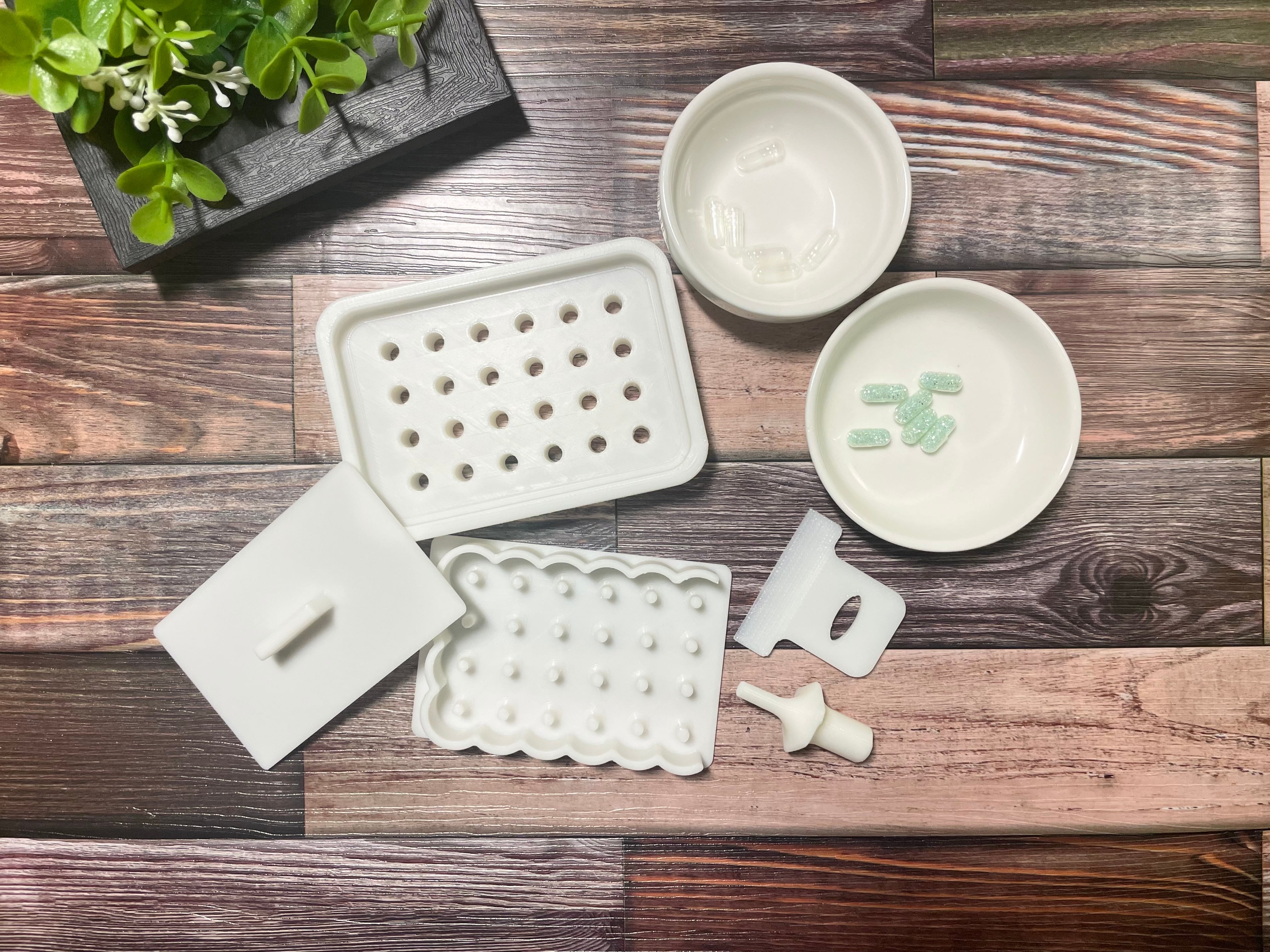 商品は、カプセルプレート、押し出しプレート、押さえフタ、押し棒、ヘラの5点です。素材はいずれもPLA樹脂です。